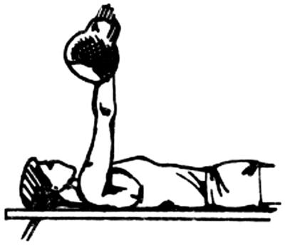 б) Жим гири 1 рукой лежа (рис. 15). И. п. — лежа на горизонтальной скамье.