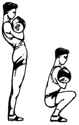 в) Приседание с гирей на груди (рис. 16). И. п. — стойка ноги врозь.