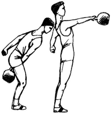 а) Поднимание 1 гири на грудь (рис. 14). И. п. — стойка ноги врозь, хват гири за ручку сверху. Выполнить замах назад (между ног) и поднять гирю на грудь.