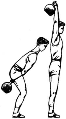 б) Рывок 1 гири двумя руками (рис. 18). И. п. — стойка ноги врозь.