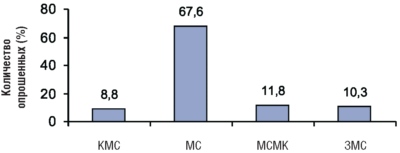 Несомненно, что спортивная квалификация дзюдоистов в некоторой степени усиливает их физкультурно-педагогическую ориентированность, но не является основополагающим фактором. Анкетирование тренеров-преподавателей сборных команд страны по единоборствам, велоспорту, стрельбе, гребному спорту выявило их спортивную квалификацию (рис. 3). Большинство среди опрошенных тренеров-преподавателей имеют квалификацию мастера спорта. Существуют обобщенные данные о том, что уровень спортивного мастерства в прошлом не является определяющим фактором эффективности тренерской деятельности (Ю. Войнар, 2000).
