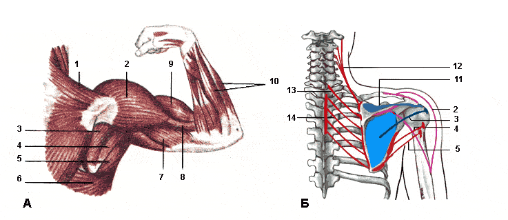 1 - трапециевидная мышца; 2 - дельтовидная мышца; 3 – подостная мышца; 4 - малая круглая мышца; 5 - большая круглая мышца; 6 - широчайшая мышца спины; 7 - трёхглавая мышца плеча; 8- плечевая мышца; 9 - двуглавая мышца плеча; 10 - мышцы-разгибатели кисти и пальцев; 11 – надостная мышца; 12 – мышца, поднимающая лопатку; 13 – малая ромбовидная мышца; 14 - большая ромбовидная мышца
