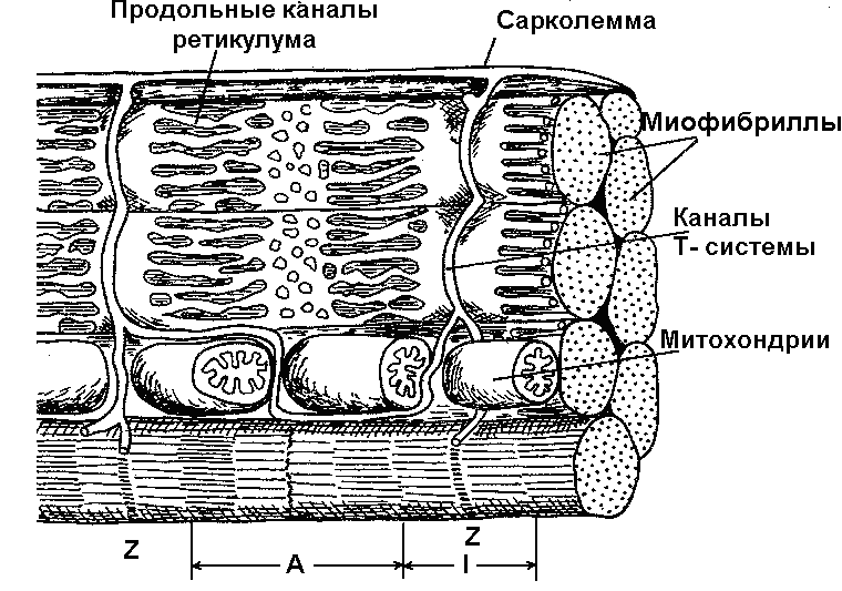 Саркоплазматический ретикулум, представляющий собой определённым образом организованную сеть соединяющихся цистерн (содержащих в большой концентрации ионы кальция) и трубочек, играет важную роль в механизмах сокращения и расслабления мышцы. Кроме того, к части ретикулума прикреплены рибосомы, специальные сферические образования, на которых и при участии которых происходит биосинтез белков. Саркоплазматическая сеть с помощью особых трубочек, называемых Т-системой, связана с оболочкой мышечной клетки. Т-система также имеет прямое отношение к мышечному сокращению, так как по ней передаётся изменение электрического потенциала поверхностной мембраны элементам ретикулума, что приводит к освобождению ионов кальция, поступающих к миофибриллам и запускающих процесс мышечного сокращения [24].