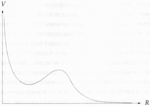 Рис. 11.1. Одна теория утверждает, что наша Вселенная находится в небольшой яме в левой части графика, что удерживает потенциальную энергию вакуума (V) на определенном уровне, а также фиксирует радиус (R) дополнительных компактифицированных измерений. Однако такое состояние не может быть вечным. Небольшое возмущение может вытолкнуть нас на правую вершину, или мы можем пройти через барьер за счет квантового туннелирования и покатиться вниз по правой части графика к бесконечно большим дополнительным размерностям. Этот процесс, за счет которого ранее крошечные размерности разворачиваются, чтобы превратиться в огромные, называют декомпактификацией (адаптировано, с разрешения, с рисунка Стива Гиддингса)