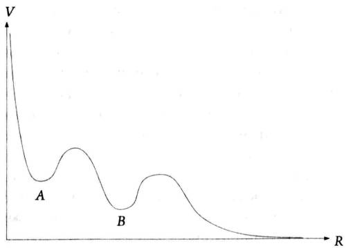 Рис. 11.2. Здесь ситуация намного интереснее, чем на рис. 11.1. Наша Вселенная все еще направляется к декомпактификации и области бесконечно больших дополнительных измерений, только на этот раз мы собираемся сделать промежуточную остановку на ландшафте вдоль этого маршрута. По этому сценарию нашу Вселенную можно рассматривать как небольшой мячик, который при скатывании вниз с холма временно задержался во впадине (А). В принципе, мячик мог бы сделать множество временных остановок при спуске, хотя на этом графике показана только одна дополнительная впадина (В) (адаптировано, с разрешения, с рисунка Стива Гиддингса)