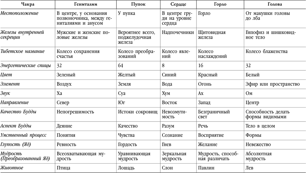 На другом конце позвоночника находятся кроновая и межбровная чакры, которые в тибетской системе также объединены и формируют единый центр кхор-ло, называемый «хдаб-стон» («hdab-ston») или «лотос с тысячей лепестков». Такое слияние вызывает интерес, поскольку межбровная чакра Аджна имеет непосредственное отношение к легендарному «третьему глазу», без которого, как повсеместно считается на Востоке, человеку недоступно провидение и ясновидение. Тибетцы, как мы увидим далее, не разделяют доминирующей на Западе мысли о том, что видения обязательно являются субъективными. Они верят, что, по крайней мере, некоторые видения представляют собой непосредственное отображение других уровней реальности. В Таблице 2 приведены основные характеристики системы кхор-ло.
