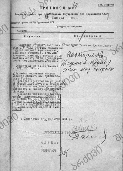 «…Обращаюсь к Вам в связи с делом Берия. Наконец настал день, когда не только для Грузии, которой выпала горькая доля многолетнего „шефства“ этого авантюриста и негодяя, но и для всей нашей страны стало ясно, что Берия — враг народа. Первые же шаги вредительской деятельности этого злостного врага были направлены к тому, чтобы беспощадно уничтожить передовую грузинскую интеллигенцию, получившую образование в России, в русских университетах, усвоивших высокую русскую культуру. Берия организовал целый ряд провокаций, подтасовывая факты из жизни и деятельности этих людей… Одной из первых жертв Берия пал и мой муж Тициан Юстинович Табидзе, один из лучших советских писателей Грузии, поэт и общественный деятель, многие годы пользовавшийся широкой популярностью у себя на родине. Тициан Табидзе был арестован 10 октября 1937 г. по личному распоряжению Берия. Накануне ареста Берия вызывал к себе Т. Табидзе и в порядке „психической атаки“ обвинил его в том, что он „дружит с русскими писателями“, а затем потребовал, чтобы Табидзе оговорил известного поэта Паоло Яшвили, которого тот же Берия за два месяца до того довел до самоубийства все возраставшими требованиями оговоров и провокаций. Берия заявил, будто Паоло Яшвили признался в пьяном виде ему, Табидзе, в том, что состоит шпионом одного иностранного государства. Когда Т. Табидзе отказался опозорить память товарища, Берия пригрозил, что арестует и Тициана и меня, его жену. Убедившись в том, что Т. Табидзе ни в коем случае не пойдет на заведомую подлость, Берия распорядился арестовать его…
