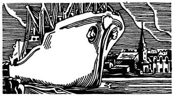 Город окутан туманом. Он поглотил все: здания, изгороди, фонарные столбы, редких прохожих. Из густой мглы возникают два тусклых глаза — такси. Лучи фар обрываются сразу перед радиатором машины. Человек на краю тротуара подымает руку, но таксомотор не останавливается, хотя и свободен. Мимо скользит панорама неузнаваемо преобразившейся улицы. Громадной светлой тенью со звоном проносится трамвайный вагон, где-то рядом трещат невидимые мотоциклы.
