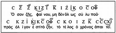 Песни, в которых каждому слогу соответствует одна нота, принадлежат к силлабическому стилю, в отличие от мелизматических, в которых на один слог приходится несколько нот. В невменной нотации восходящая последовательность звуков записывалась в виде близко расположенных квадратов, которые читались снизу вверх. Нисходящий звуковой ряд отображался невмами в форме ромбов, которые читались слева направо. Например, существовало четыре варианта записи слога, пропеваемого тремя нотами: