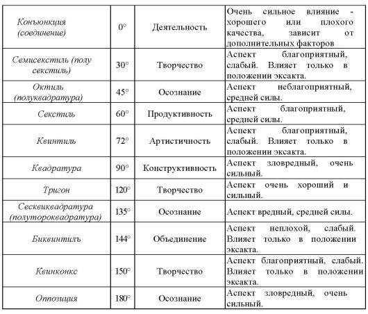 Также аспекты различаются по силе воздействия (см. Приложение, табл. 1) и разделяются на мажорные, т.е. сильные, и минорные, более слабые.