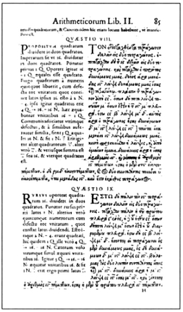 выше), рядом приводилась фраза, которая стала одной из самых известных в истории математики: «Я нашел этому поистине чудесное доказательство, но поля книги слишком узки для него». Многие хотели бы оказаться рядом с Ферма, чтобы предложить ему в тот момент чистый лист бумаги! Несмотря на все усилия Самуэля Ферма, ему не удалось найти в рукописях отца ничего, что как-то касалось бы предполагаемого доказательства, и потомкам пришлось довольствоваться лишь доказательством для n = 4, которое опубликовал сам Ферма. «Поистине чудесное доказательство» гениального французского математика оказалось утерянным навсегда.Страница 85 «Арифметики» Диофанта в переводе Баше де Мезириака. На этой странице описывается задача 8 книги II. Читатель может оценить ширину полей, на которых не поместилось «чудесное доказательство» Ферма.