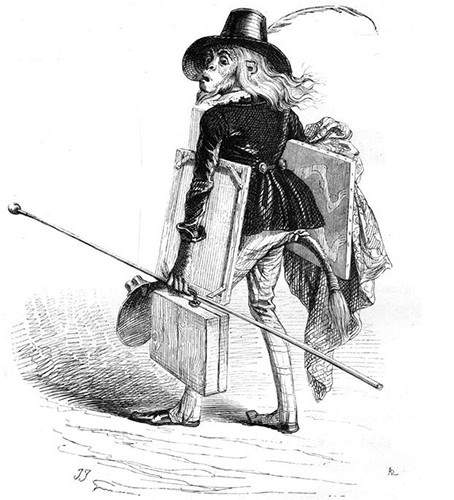 «И я тоже художник» (ит.) — легендарное восклицание Корреджо перед картиной Рафаэля. Тема обезьяны-живописца была чрезвычайно популярна в живописи: в XVII веке обезьяну перед холстом и с кистью в лапе рисовал Давид Тенирс, в XVIII веке картины под названием «Обезьяна-художник» создали Жан Симеон Шарден (ок. 1699–1779) и Жан-Батист Деэ (1729–1765). В XIX веке эту традицию продолжил Александр-Габриэль Декан (сам себя называвший «живописцем обезьян»), выставивший в Салоне 1833 года свой вариант «Обезьяны-живописца». Гранвиль также отдал дань этой традиции еще в сборнике «Метаморфозы» (1828–1829), где на литографии «Академия рисунка» изобразил сразу нескольких обезьян, занятых рисованием с натуры (см.:Renonciat A. La vie et l'oeuvre de J.-J. Grandville. — Paris, 1985. P. 48).