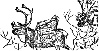 Впереди идет большой олень — это вожак. На каждом олене ноша. Вот шагает осторожный олень. Он бережно несет свою ношу, посматривая по сторонам большими умными глазами. На его спине крепко привязана нарядная деревянная сумка-люлька. Сумка расшита разноцветным сукном и блестящими стеклышками-бисером. Из люльки выглядывает хитрое личико с черными узенькими глазками.