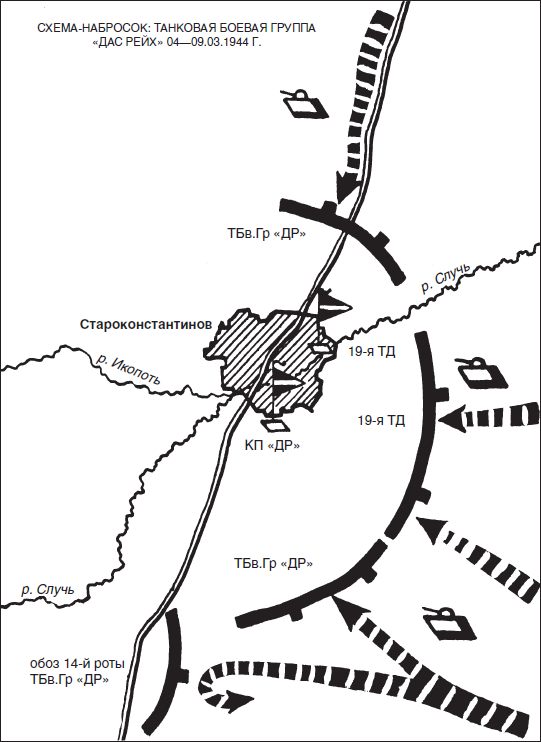 С этого момента боевая группа перешла в подчинение 19-й танковой дивизии под командованием генерала Кельнера, которая занимала позиции юго-восточнее Староконстантинова и все танковые части которой вели бой против наступающего на город уже с юго-востока противника.