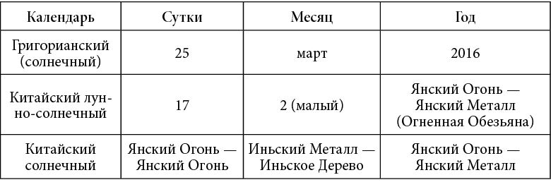 Современный календарь вань нянь ли фактически представляет собой сочетание трех календарей: григорианского (солнечного), китайского лунно-солнечного и китайского солнечного. Возьмем для примера сутки, в которые я пишу эти строки. В ТКК они представлены тремя способами (см. табл. 1).