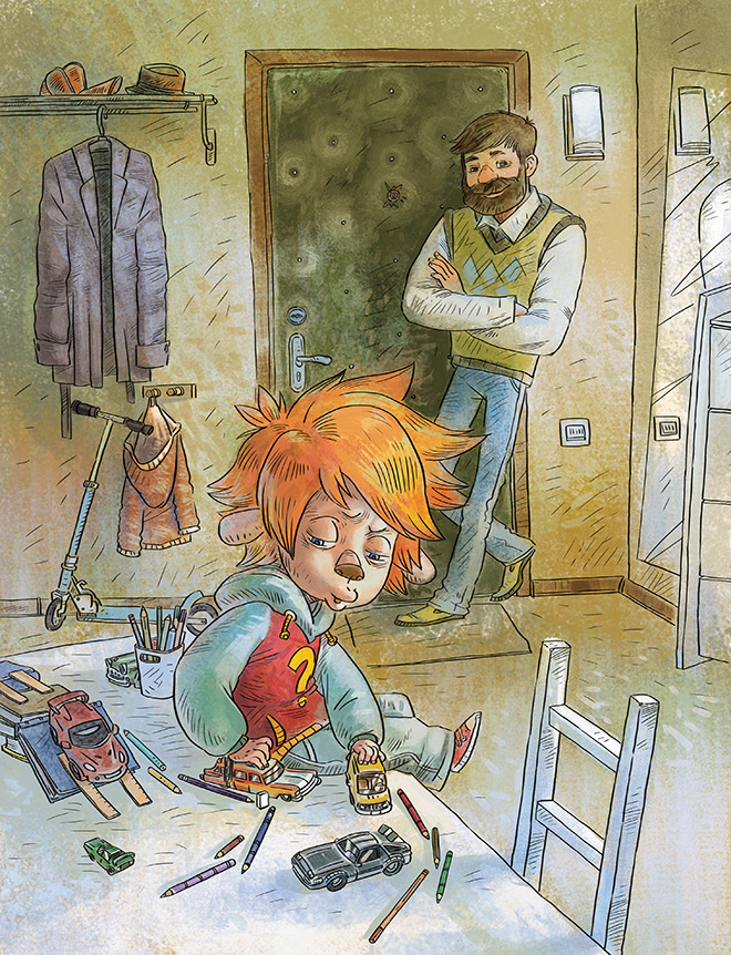 – Здравствуй, дядя Кузя! Да я тут нашёл в коробке с игрушками машинки и решил поиграть. Смотри, какие они быстрые! Врум-врум…