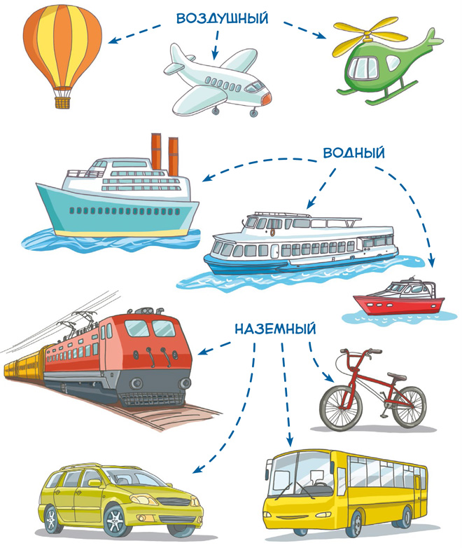 – Да, велосипед тоже относится к наземному транспорту. Наземный – значит, движется по земле. Существует ещё воздушный транспорт: самолёты, вертолёты. И водный: пароходы, катера, баржи. Мы с тобой познакомимся со всеми видами транспорта, но сперва давай узнаем, с чего началась его история: на чём ездили люди до появления автомобиля.