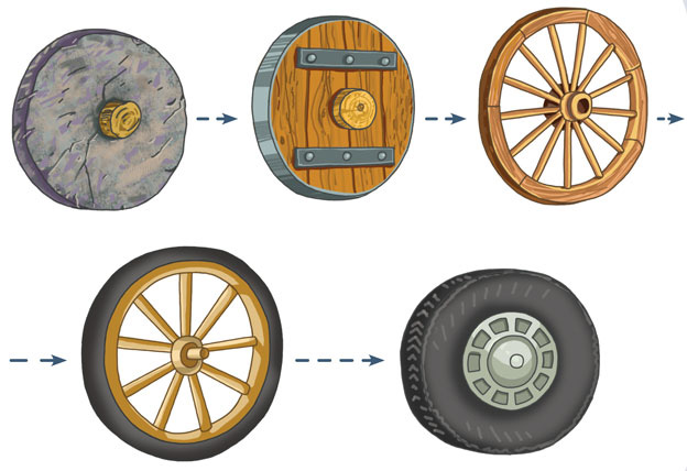 – Конечно, Чевостик! Изобретение колеса оказалось очень важным и нужным шагом для развития всего человечества. Когда люди совершили это открытие, они додумались насадить два колеса на палку – ось, а сверху приделали настил из деревяшек. Так получилась повозка. Осталось только впрячь в неё быков, а впоследствии и лошадей, усадить возницу, который будет править, – и первое транспортное средство готово.