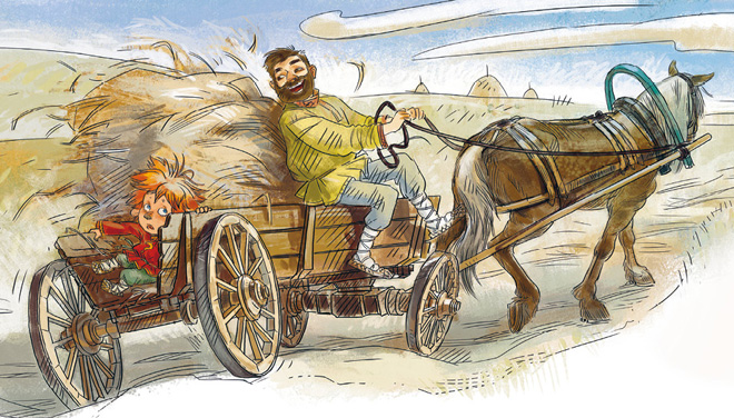 – Верно. Такую повозку называют телегой. От центра каждого колеса расходятся деревянные бруски – спицы. Их концы крепко приделаны к ободу, на котором, собственно, колесо и катится. А к днищу этой телеги прикрепили боковые стенки – борта. Полезная придумка, между прочим. Благодаря бортам груз из крестьянской телеги не вываливается на дорогу.