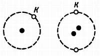 Как ты, очевидно, знаешь, наиболее простое строение имеет атом водорода. Он состоит из одного протона и одного электрона, находящегося на оболочке К. В атоме гелия вокруг двух протонов ядра на этой же оболочке К вращаются два электрона (рис. 3).