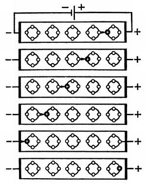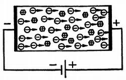 Придя с той стороны, где находится отрицательный полюс, электрон заполнил дырку трехвалентного атома. Следовательно, электрон приблизился к положительному полюсу, тогда как новая дырка образовалась в соседнем атоме, расположенном ближе к отрицательному полюсу. Затем происходит это же явление. Новая дырка в свою очередь заполняется электроном, приблизившимся таким образом к положительному полюсу, а образовавшаяся за этот счет дырка оказалась еще ближе к отрицательному полюсу. И когда в итоге такого путешествия электрон достигает положительного полюса, откуда он направляется в источник тока, дырка достигает отрицательного полюса, где она заполняется электроном, поступившим из источника тока.
