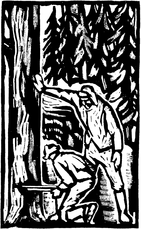Работает вальщик один. Столкнуть дерево в нужную сторону помогает клин, вставляемый в распил перед концом валки.