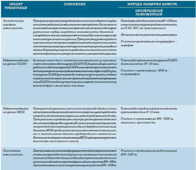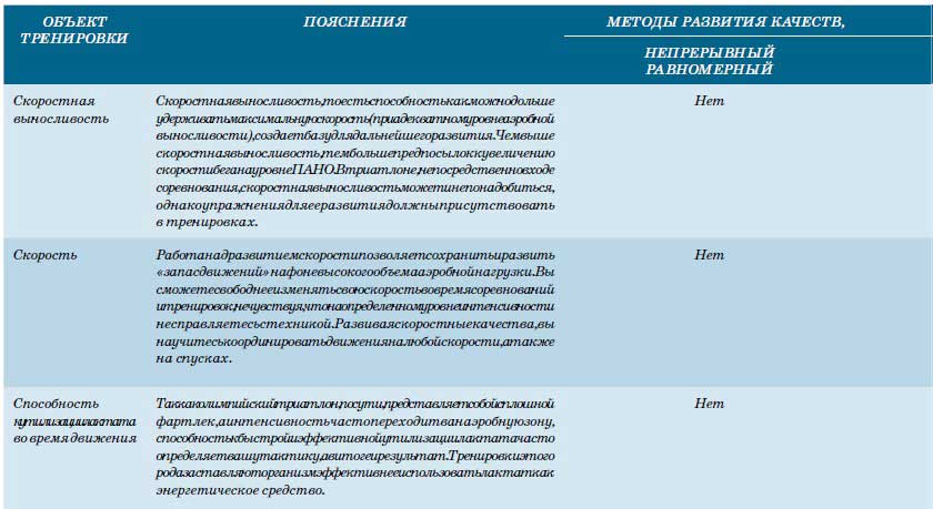 В дополнение к таблице хотелось бы отметить, что все составляющие тренинга функциональных качеств перекликаются. Организм — не машина c механической коробкой передач, все процессы в нем плавно взаимодействуют и перетекают из одного в другой. Поэтому тренируя, например, лактатную выносливость, вы во многом будете тренировать и свою способность работать на максимальном потреблении кислорода, а также, возможно, и скоростную выносливость. Тренировка — всегда многоуровневый и многофакторный процесс.
