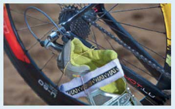 7. Прищелкните велотуфли к педалям, расстегните их и закрепите резинками в зависимости от того, как вы запрыгиваете на велосипед. Резинка одной туфли, прикрепленная к ее заднику, крепится к скобе переднего переключателя, другая — вокруг нижнего заднего пера. Во время движения эти резинки соскочат или порвутся. В случае если вы еще не умеете запрыгивать на велосипед, поставьте расстегнутые велосипедные туфли около него со стороны вбегания в транзитную зону после плавания. Насыпьте в них немного детской присыпки.