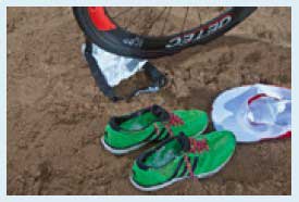 12. Поставьте кроссовки около велосипеда со стороны вбегания в транзитную зону после велоэтапа. В кроссовки вставьте резинки вместо шнурков. Немного смажьте вазелином (обязательно в резиновых перчатках) задники и края кроссовок, чтобы они легче надевались и не натирали ноги во время бега. Насыпьте в них также немного детской присыпки.