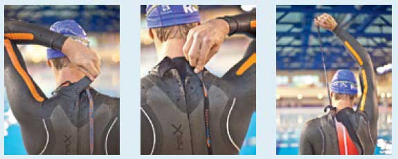 3. На бегу сдвиньте плавательные очки на лоб, поймайте веревку от застежки гидрокостюма, если вы плыли в нем, и расстегните его.