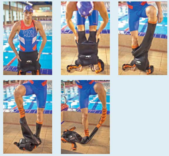 7. Сдерните двумя руками гидрокостюм с туловища вниз и выньте сначала одну ногу, потом другую. При необходимости помогайте себе руками.