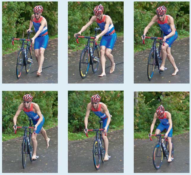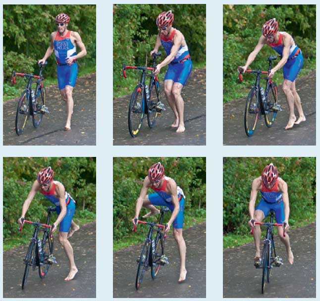 Быстрая посадка на велосипед — важный момент в условиях острой конкуренции, присущей олимпийскому триатлону. В зависимости от того, какая педаль находится спереди, наиболее распространены два основных способа быстрой посадки.