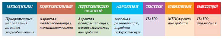 Поскольку мезоцикл — это период, в течение которого решаются определенные задачи, то и называются они в зависимости от того, на что конкретно направлены. Сводные данные о мезоциклах представлены в табл. 3.3–3.10.