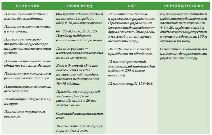 второй части подготовительного мезоцикла рекомендуется включать в тренировочные занятия упражнения, нацеленные на увеличение скоростного потенциала, а также небольшие развивающие серии аэробного характера. Подготовительный мезоцикл как будто очерчивает контуры того, чем вы будете серьезно заниматься в течение последующих месяцев. Работа над техникой движений во всех видах является здесь центральной.Это самая тяжелая часть макроцикла. Объем тренировок по сравнению с аэробным макроциклом не снижается или снижается незначительно. Интенсивность возрастает. В этом мезоцикле вы значительно увеличите окислительный потенциал мышц. Основной метод тренировки по-прежнему непрерывный равномерный, непрерывный переменный, прогрессивный. Также более часто начинают применяться интервальные тренировки (табл. 3.6). Несмотря на то что интенсивность возрастает, паузы отдыха остаются небольшими. Мезоцикл способствует формированию устойчивого высокого темпа, и в конце этого периода вы уже сможете довольно успешно соревноваться. Основная тренировочная работа происходит в аэробной развивающей зоне и на верхней границе — ПАНО. Результатом этого мезоцикла станет уменьшение пульсовой и кислородной стоимости работы, увеличение скорости (или снижение пульса) на уровне ПАНО. Во второй половине мезоцикла начинается основная тренировочная работа на околосоревновательной скорости. Выполнение тренировочной работы в этот период определяет базовый уровень результата, который вы покажете в любых обстоятельствах.