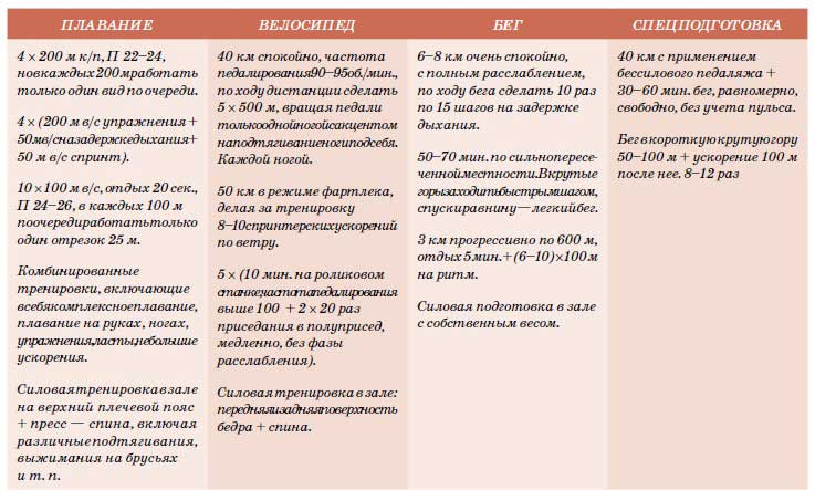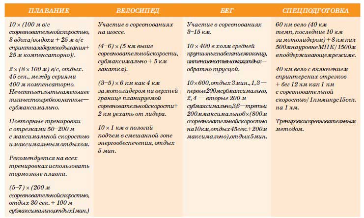 Именно в этом мезоцикле происходит основная тренировочная развивающая работа, которая позволит вам соревноваться на дистанции олимпийского триатлона по-настоящему быстро. Объем тренировочных занятий уменьшается, интенсивность возрастает. Предпочтение отдается интервальному методу тренировки. Тренировки на уровне МПК выходят на первый план (табл. 3.7). Интервалы отдыха увеличиваются, длина отрезков по сравнению с темповым мезоциклом уменьшается, скорость возрастает. В интенсивном мезоцикле организм научится не только экономно использовать кислород и энергию, но и эффективно их распределять. Вы приобретете значительную толерантность к процессам, связанным с образованием и утилизацией лактата. Длительность этого мезоцикла строго индивидуальна. Чем квалифицированнее триатлет, тем более длинным должен быть этот мезоцикл, но не больше 4 недель. Кроме того, выносливые триатлеты, которые больше тяготеют к темповой работе, могут увеличивать интенсивность в этом периоде за счет непрерывного метода, а не интервального. Особое внимание в этот период следует уделить восстановительным мероприятиям.