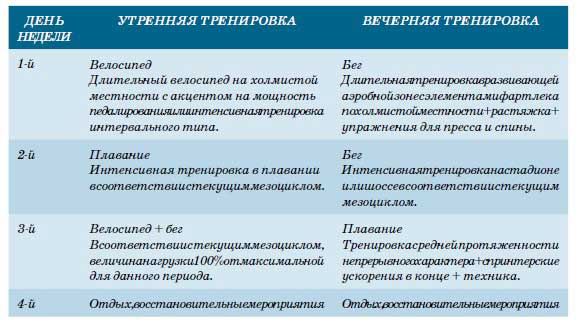 Четырехдневный микроцикл может использоваться в качестве тренировочного средства с повышенным восстановительным компонентом и при необходимости коррекции уровня готовности в какой-либо одной дисциплине. Баланс достигается путем использования двух видов данного микроцикла — «плавательного» и «велосипедного», которые следуют друг за другом (табл. 3.15 и 3.16).