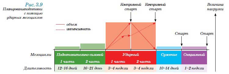 В этом случае (когда важных стартов немного) необходимо применить методику стрессовых нагрузок, построенную на предположении, что для обеспечения желаемого адаптационного сдвига организма объем тренировочной нагрузки должен расти одновременно с интенсивностью. Принципы построения мезоциклов были объяснены ранее, поэтому здесь ограничимся лишь схемой (рис. 3.9).