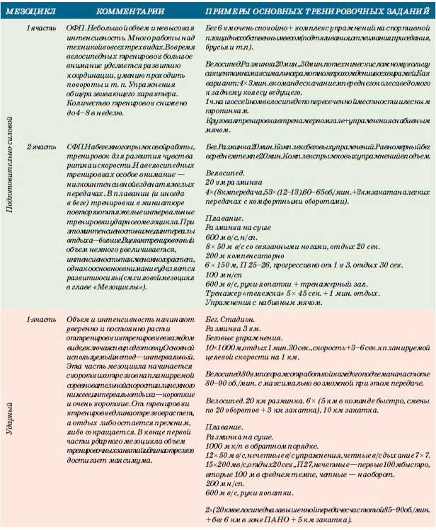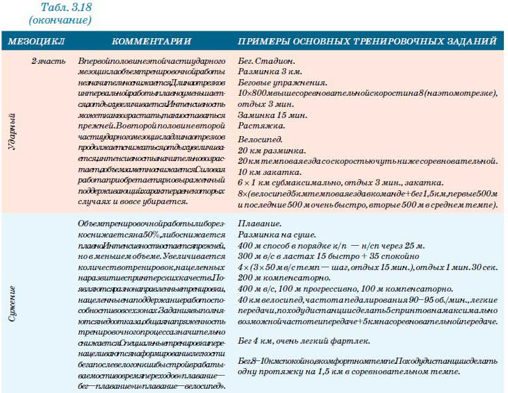 Как вы видите на рисунке, подготовка разделена на три части: на подготовительно-силовой мезоцикл (из двух частей), ударный мезоцикл (из двух частей) и сужение. В случае нескольких стартов, следующих друг за другом, после сужения идет специальный мезоцикл (как правило, состоящий из одного-двух микроциклов или без них). Во время ударного мезоцикла вы достаточно резко прибавляете объем тренировок, одновременно увеличивая интенсивность. При этом объем должен все время расти до конца первой части, а интенсивность стабилизируется после 2/3 первой части мезоцикла (меняется структура тренировочного занятия — уменьшаются интервалы отдыха). С начала второй части ударного мезоцикла объем начинает снижаться, а интенсивность — расти. Использование ударного мезоцикла — это очень тяжелое испытание. Не ждите, что на тренировках вам будет всегда легко и комфортно. Чаще всего вы будете чувствовать себя очень уставшим. Внимательно отнеситесь к восстановительным мероприятиям. Сводная информация по описываемому варианту подготовки представлена в табл. 3.18.