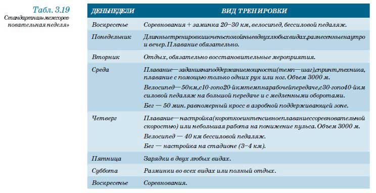 после первого старта через неделю следует еще один, потом еще и так далее, то необходимо использовать специальный мезоцикл в форме одного недельного микроцикла. Стандартная «межсоревновательная» неделя, которая позволяет какое-то время удерживать высокую спортивную форму, дана в табл. 3.19.Этот вариант абсолютно не похож на то, о чем мы говорили ранее, хотя и основывается на тех же общеизвестных принципах спортивной тренировки. Здесь подразумевается большое количество стартов.