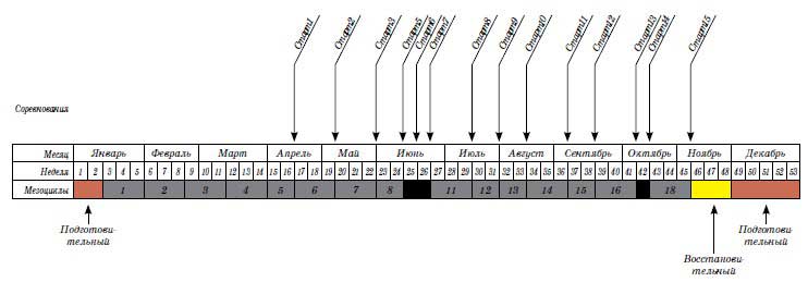 Как вы видите, в течение года используется большое количество мезоциклов. Кроме восстановительного, подготовительного и специальных мезоциклов (обозначены красным и соответствуют специальным мезоциклам, описанным в случае «Серьезного подхода»), все они имеют одинаковую следующую схему построения (табл. 3.20).