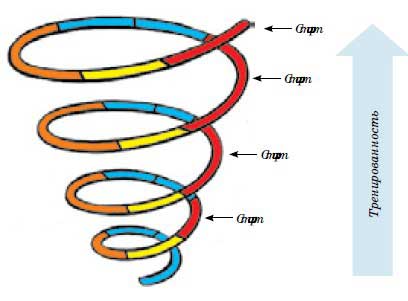 Предполагается, что каждый такой мезоцикл решает задачу выхода спортсмена на новый уровень работоспособности. Каждый последующий мезоцикл должен начинаться с этого нового уровня, обеспечивая, таким образом, последовательное развитие спортивной формы по спирали (рис. 3.11).