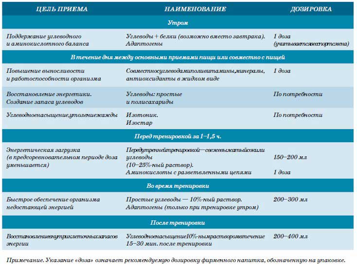 значение в углеводном насыщении (наряду с приемом продуктов с высоким гликемическим индексом) имеет время потребления углеводов. Чем раньше после физической нагрузки начат прием, тем эффективнее процесс гликогенообразования (так же как и при приеме фосфагенов). Потребление высокоуглеводных жидкостей и продуктов сразу же после продолжительной тренировки или соревнований увеличивает скорость накопления гликогена в мышцах и способствует быстрому восстановлению.Во время утренней или вечерней тренировки энергетические напитки рекомендуется принимать, если тренировка длится более 90 мин. Также в обязательном порядке необходимо принимать энергетики во время утренней или вечерней тренировки в подростковом возрасте, то есть когда при интенсивном росте организма и значительных энерготратах возможно чрезмерное расходование собственных аминокислот на обеспечение организма энергией. Быстрое восстановление запасов гликогена позволяет более эффективно проводить вторую тренировку и полностью восстановиться к следующему дню.
