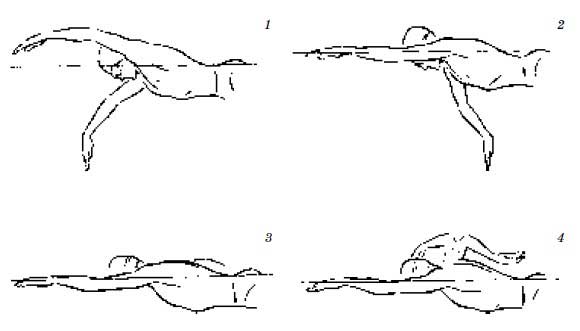 18. «Правой — левой — левой — правой». Упражнение выполняется в следующей последовательности: из положения 2 переход с правой на левую руку — переход с левой на правую руку — возврат левой руки в положение 1 — гребок левой рукой. Повторить.