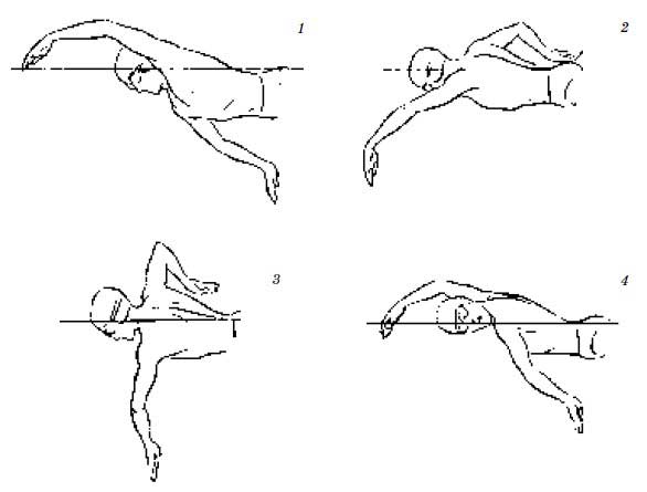 17. Переходы с гребками из положения 3. Упражнение «1–6—1» В положении 3 сделать 6 ударов ногами кролем, затем гребок одной рукой и одновременно пронос другой и перевернуться в положение 3 на другой бок.