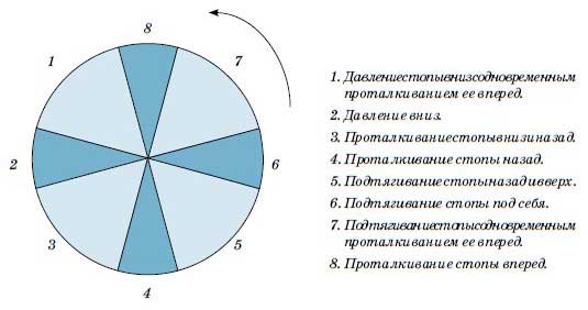 То, насколько правильно вы вращаете педали, во многом определяет экономичность и эффективность работы в целом. Основной смысл эффективного приложения усилий к педалям сводится к круговому педаляжу (рис. 1.13). Вы должны не только давить на педали, но и подтягивать их.