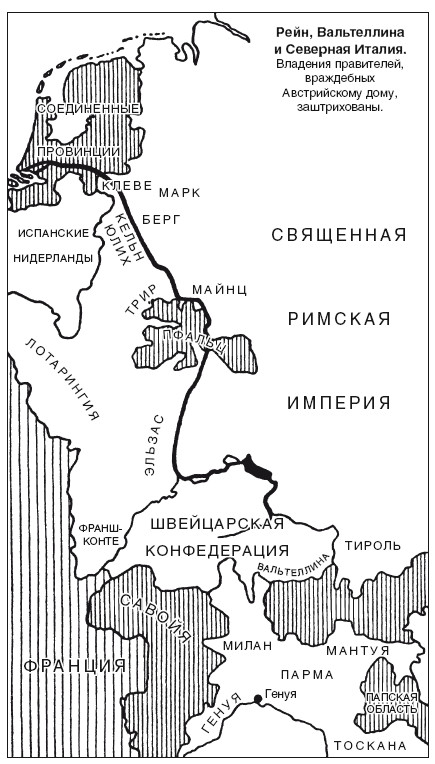 В Лондоне испанский посол требовал казни Уолтера Роли (Рэли), а вокруг дворца собралась толпа, осыпавшая проклятиями короля, слишком слабого, чтобы его спасти. В Гааге соперничество двух религиозных группировок вновь и вновь перерастало в открытый бунт, а вдову Вильгельма Оранского Молчаливого (1533–1584, убит по заказу испанского короля Филиппа II наемным убийцей) освистывали на улицах. Между Францией и Испанией сложились крайне напряженные отношения, поскольку обе державы претендовали на контроль над долиной Вальтеллиной (ныне в Италии, провинция Сондрио в Альпах) – важнейшей дорогой из Италии в Австрию. В Париже боялись скорого разрыва и европейской войны; в Мадриде гадали, удержится ли под таким давлением недавно заключенный брак инфанты Анны с юным королем Франции. Семнадцатилетний Людовик XIII относился к авансам супруги с ледяным равнодушием, и расторжение неосуществленного брака могло в любой момент разрушить последнюю гарантию дружбы между правящими династиями Франции и Испании. Напрасно австрийские кузены испанского короля посредничали из Вены и ненавязчиво предлагали устроить помолвку молодого эрцгерцога и французской принцессы: регентское правительство в Париже, проигнорировав их, вступило в переговоры о ее браке со старшим сыном герцога Савойского – заклятого врага и австрийских, и испанских властей.