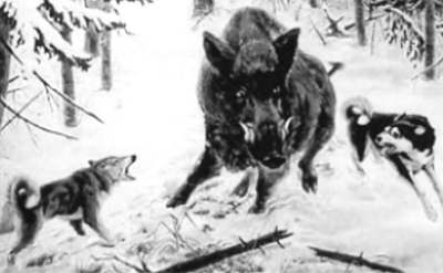 Фырканье. «Сундук» тихо вбирает воздух и с шумом его выпускает. Кабану не нравятся запахи на поляне. Он медленно, с остановками делает круг у поляны и решается наконец…