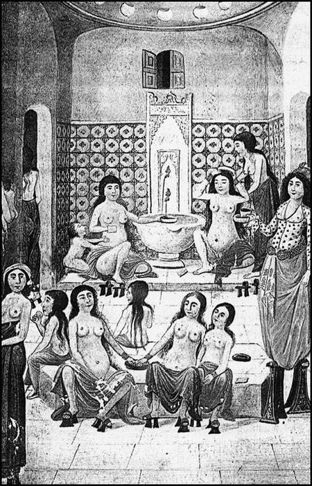 Женщины в Константинополе ходят в баню каждую неделю по четвергам, поелику пятница у них так как у нас воскресение, почитается, и они за долг поставляют, чтобы накануне оного дни обмываться и обривать или очищать излишние на теле волосы, кроме головы и бровей, и притом и для препровождения времени, потому что каждый турок, каков бы ревнив ни был, однако ж жену свою в баню однажды в неделю отпустить непременно должен, куда они собираются, как на некоторое празднество, или гульбище, и наряжаются в самое лучшее платье, берут с собою кушанье, кофе и всякие фрукты и закуски и так нагие нередко от утра до вечера время с музыкою и с песнями препровождают.