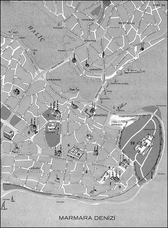 Карта Стамбула: 1 – Ипподром; 2 – Змеиная колонна; 3 – Обелиск Феодосия; 4 – Колонна Константина; 5 – Колонна Константина Порфиродного; 6 – Капалы Чарши; 7 – Сюлеймание; 8 – Шахзаде; 9 – Ахмедие; 10 – Топкапы