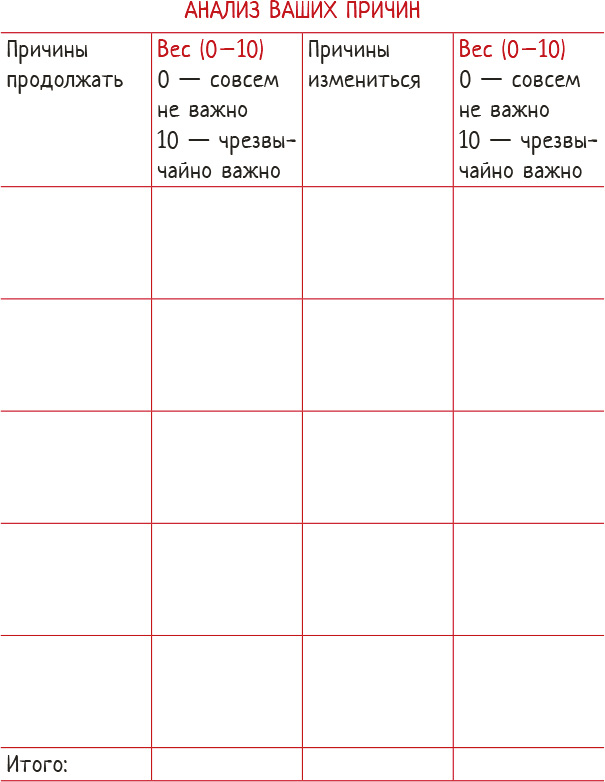 Рассмотрим причины употребления веществ, вызывающих зависимость, а также причины отказа от их употребления. В отдельном блокноте или используя бланк «Анализ ваших причин», сравните свои причины для того и другого. После того как вы их перечислите, оцените их вес (то есть их важность) для вас от 0 (совсем не важно) до 10 (чрезвычайно важно).